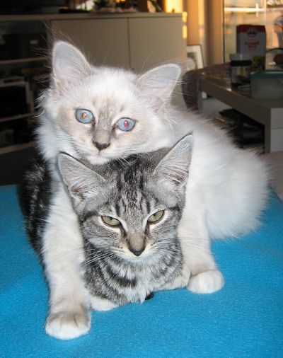 Unsere neuen Mitbewohner, seit Ende Oktober 2005. Sie ist eine Heilige Birma Katze (die Weiße) und er ein Hauskater (der schwarz Getigerte).